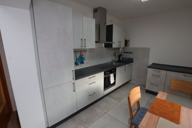 Weiterhin befindet sich in der Küche ein Herd mit Ceranfeld und Backröhre, eine Spülmaschine und ein Kühlschrank mit einem Gefrierfach.