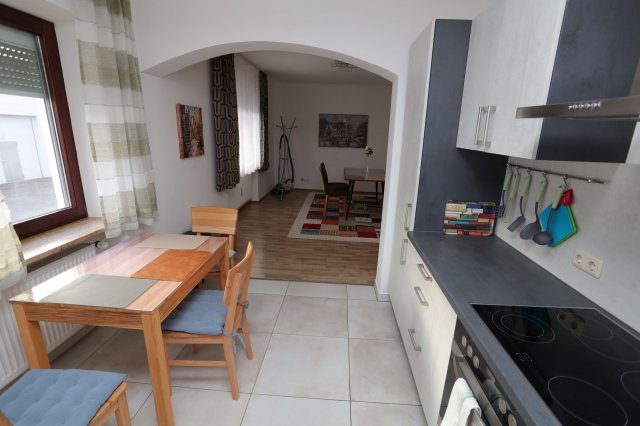 Küche und Esszimmer sind räumlich beieinander. Die voll ausgestattete Küche enthält Kochgeschirr, Essgeschirr, Besteck und Gläser.