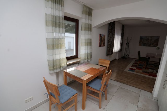 Küche und Esszimmer sind räumlich beieinander. Die voll ausgestattete Küche enthält Kochgeschirr, Essgeschirr, Besteck und Gläser.