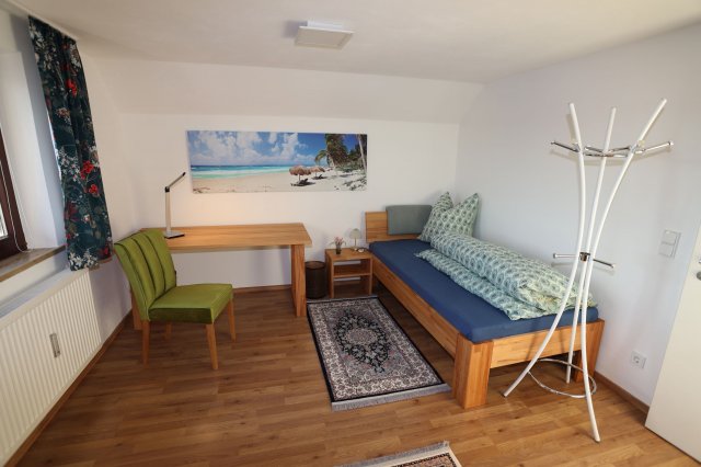 Die Grundfläche des Zimmers (1) beträgt ca 18,5 m². Das Zimmer ist komplett neu ausgestattet und möbliert. Die Möbel sind neu und bestehen aus Massivholz (Wildbuche).